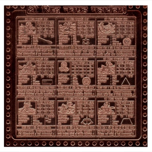 Navagraha Yantra helps to negate the malefic effects of the nine planets (Sun, Moon, Mars, Mercury, Jupiter, Venus Saturn, Rahu & Ketu) and bestows beneficial effect. The Nav Graha Yantra is recommended for all individuals whose birth charts indicate negative positioning of planets within the horoscope that can affict one's health,prosperity and peace of mind.
